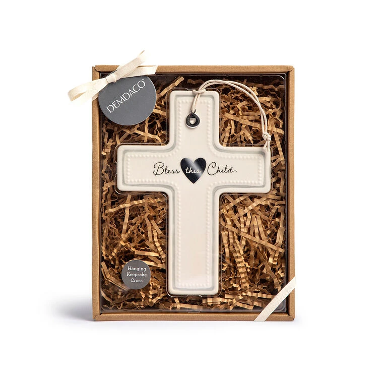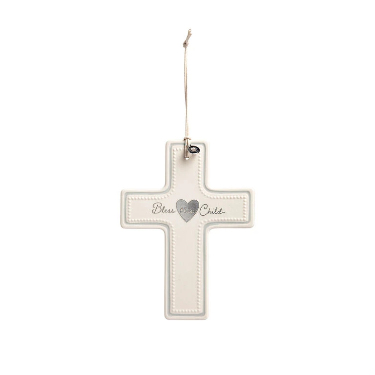 Share blessings for a special little one with this pretty wall cross for a nursery or bedroom. This heirloom-quality ceramic cross features a sweet message and silver metal charm with open heart design. Embossed beaded edging, silver trim and a loving message add sweet charm to this hanging cross that comes packaged in a windowed gift box with shredded paper padding. It makes a great gift and can be displayed on a wall with the cord hanger, included.