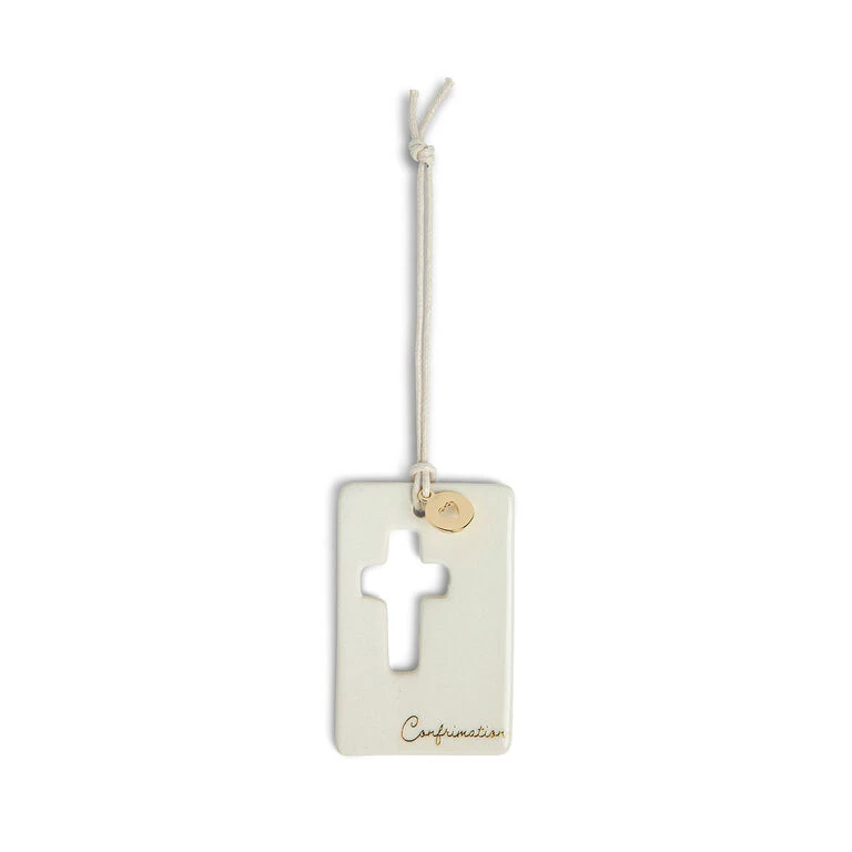 Commemorate a religious milestone moment in a charming way with this confirmation token for a child. This heirloom-quality ceramic token features a sweet message and cutout cross design plus an open heart metal charm and comes packaged in a windowed gift box with shredded paper padding. It makes a great gift and can be displayed as an ornament or decoration with its cord hanger, included.